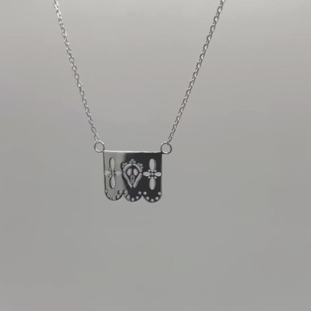Embrace the beauty of tradition with our papel picado inspired necklace, a delicate tribute inspired by the artful papel picado banners seen during Día de los Muertos celebrations in Mexico. This sterling silver necklace captures the essence of these iconic decorations, symbolizing the joyful spirit of honoring loved ones. Wear this piece as a celebration of life, memory, and heritage—a meaningful keepsake to carry the beauty of Mexican tradition close to your heart.